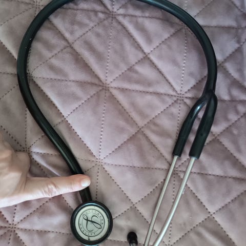Helt ny aldrig använd, enbart testad så att den fungerar och därefter avspritad. Komplett med alla tillbehör från köp. 100% original från Littmann. Perfekt för läkare, läkarstudenter eller sjuksköterskor. Enda värt att anmärka är att den har en diskret ingravering på ena bygeln som lyder "Pelafen®" (se sista bilden), som är 1,7 x 0,5 cm och syns knappt. Går säker skrapa bort om man vill. Jag köpte denna ny begagnad på nätet för en tid sedan och troligen köptes den ny av det företaget ursprungligen.