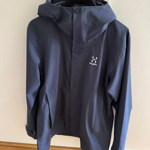 Svart Haglöfs Gore-Tex jacka i stl M med hel dragkedja fram. Har huva och två snedställda fickor med dragkedja.