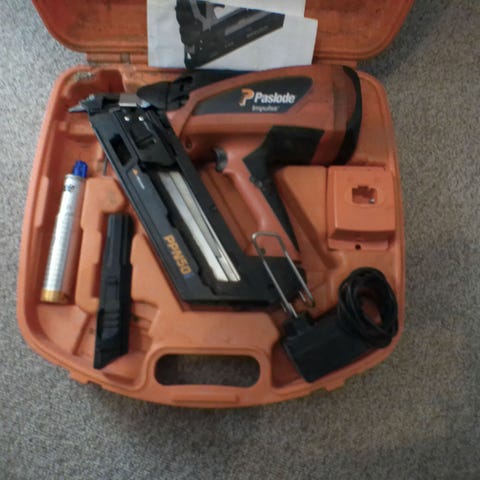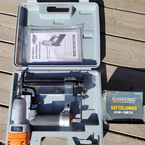 Dyckertpistol/spikpistol från Meec Tools i plastväska. Använd 1ggr till en panelvägg, resten av spikarna är kvar.