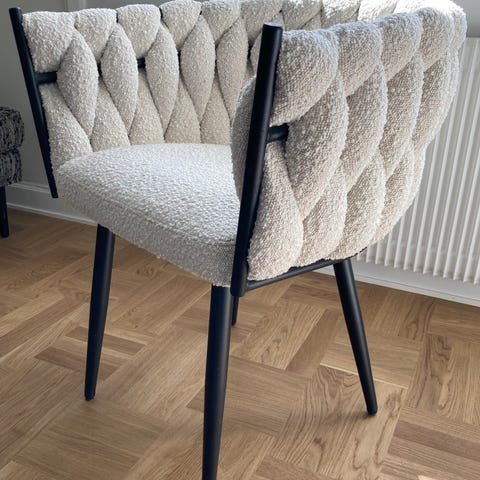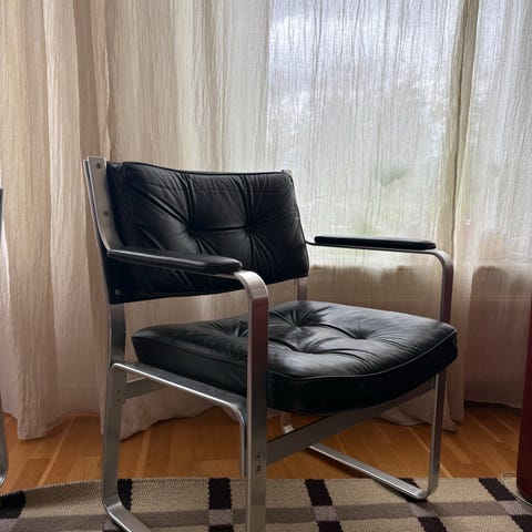 Inköpt på Länna Möbler. Stolen har en bekväm sits och och upplevs inte ta plats med sin luftiga design.