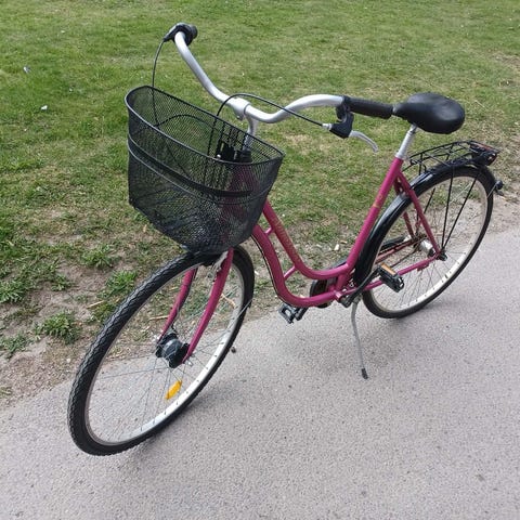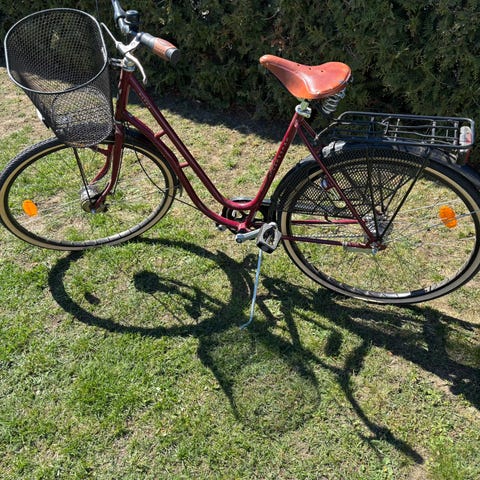 Röd damcykel 26 tum med vit sadel, stor framkorg och pakethållare bak. Utrustad med stark intern och extern belysning. Cykeldator. Lås ingår ej!