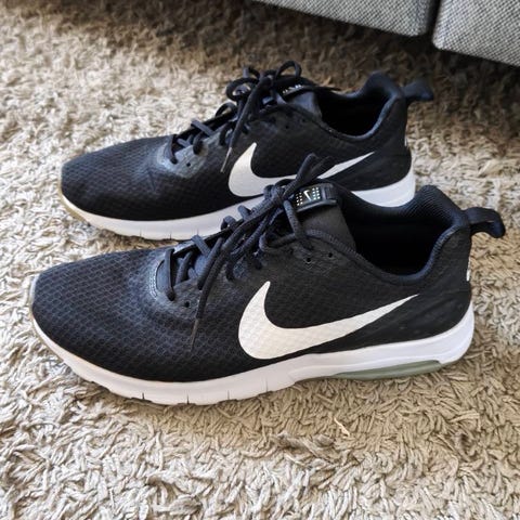 Grå Nike träningsskor i stl 42 med svart swoosh-logga. Snörning framtill och vit sula som ger ett sportigt utseende. Hör av er vid intresse!