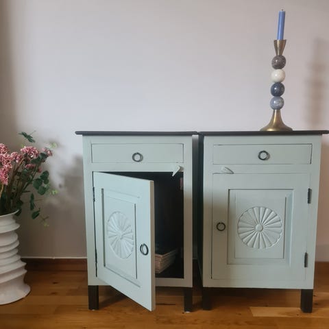 Nyrenoverade nattduksbord 1930/40-tal i Art Deco stil. Borden är bemålade i en fyllig varm mörkbrun kulör och har en snäckskal dekor. Mått H51xB41xD35 cm, hämtas i Upplands Väsby.