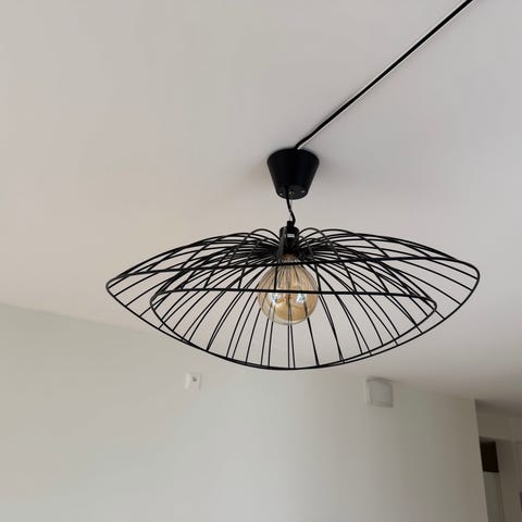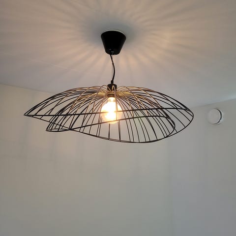 Lampan består av en handsvetsad stålgallerbur som omger det munblåsta glaset.