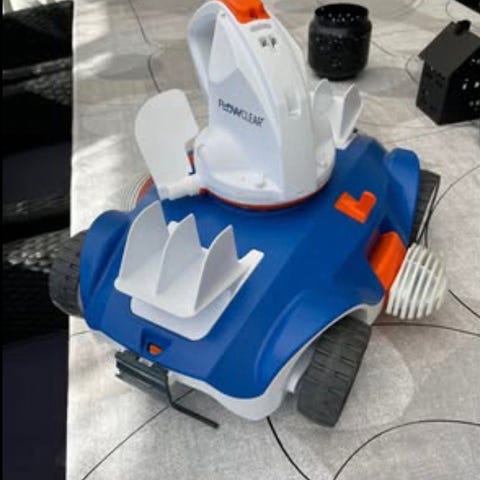 Pooldammsugare från Zodiac på vagn med styrpanel upptill. Lång slang lindad runt handtaget och stora hjul som gör den lätt att rulla runt vid poolen.
