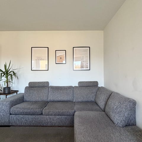 Beige hörnsoffa med schäslong, mått ca 290x150 cm och sittyta ca 90 cm bred.