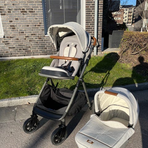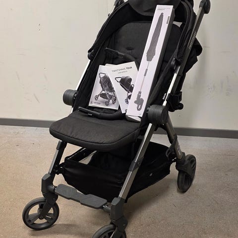 Twistshake Tour sulky/sittvagn i mörk färg, lätt att fälla ihop och med svängbara framhjul. Regnskydd och manual finns med på bilderna.