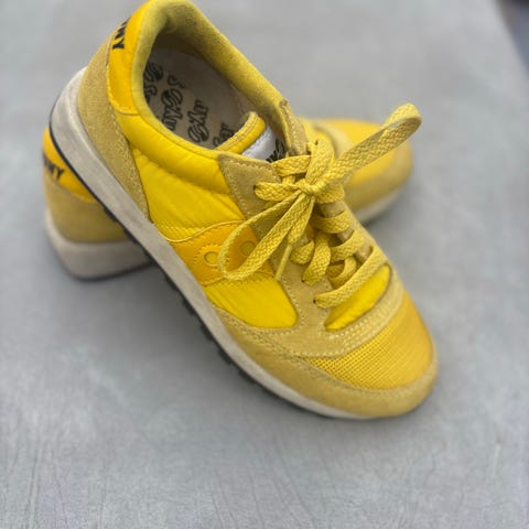 Saucony träningsskor i stl 38 i rosa och beige med snörning. Mjuk ovandel i mockaliknande material och klassisk Saucony-logga på sidorna och hälen.