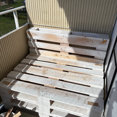 4 stycken helt nya tjocka dynor med mått passande lastpallar. Inklusive 2 avslut (som på bilden). Ljusgrå. Ordinarie pris 4000 kr.