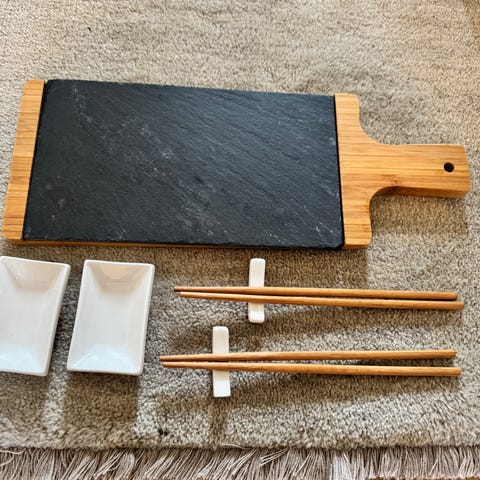 Paket med avlånga vita fat från okänt märke tillsammans med mörka ätpinnar. Ingår även små träskålar, hållare för pinnarna och en flätad bricka.