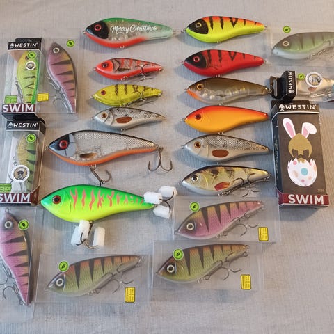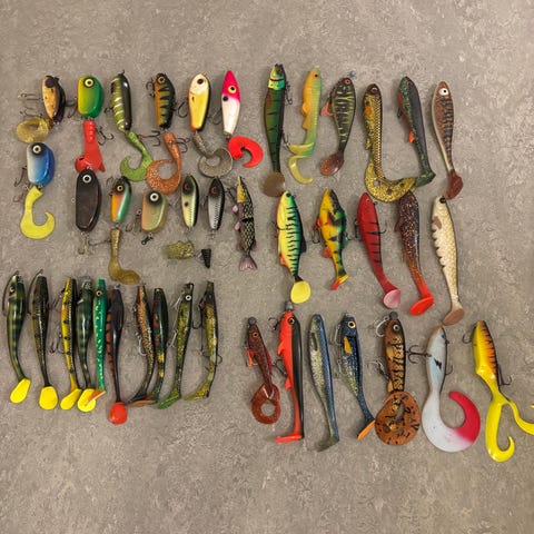 Stort parti fiskedrag Busters Jerks i många olika färger och mönster, både lösa och några kvar i förpackning. Flera olika modeller och storlekar, bra mix för den som vill fylla upp beteslådan.