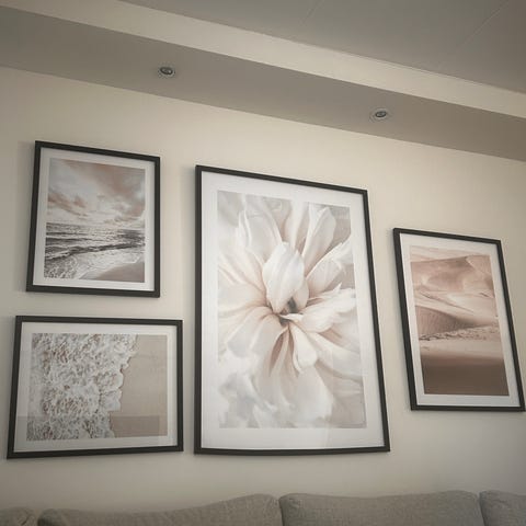 Tre tavlor från IKEA med motiv av palmblad och en stor blomma i mitten. Alla sitter i likadana tunna ramar och går i gråa och beige toner.
