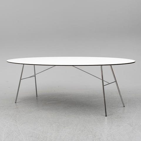 Bordet har en vit corian skiva samt ljusa trä ben. Kan användas till konferensbord , matsalsbord , köksbord eller mötesbordet också. Storleken är 120X300 cm och upplevs väldigt nätt. (Innan flytten så hade vi det i våran matsal i lägenheten med snygga Y-stolar till. ) Passar både i hemmet och på kontoret.