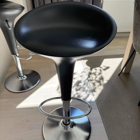 Två stycken höj- och sänkbara barstolar. Den ena stolen är vinglig.