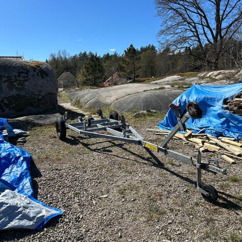 Dubbelaxlad båttrailer med många rullar och justerbara stöd för skrovet. Utrustad med vinsch fram, ljusramp och skärmar över hjulen.