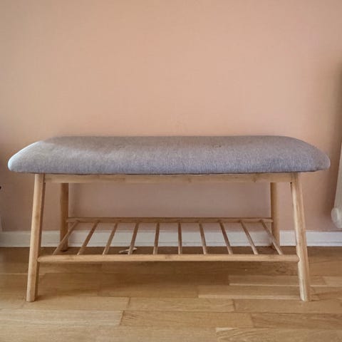 IKEA sittbänk Stocksund med förvaring i beige tyg och ben i trä. Locket lyfts upp så du får ett förvaringsutrymme under sitsen för t.ex. kuddar eller filtar. Tyget går att ta av och tvätta. Har använts som sittbänk i hall. Säljes pga flytt.