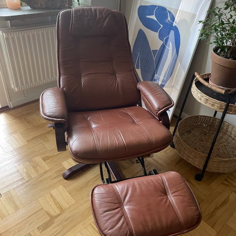 Vi säljer vår skinnfåtölj med fotpall från MIO. Fåtöljen är fällbar och superbekväm. Några små skador på skinnet. I övrigt i mycket gott skick.