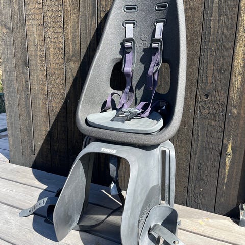 Barnstol för cykel, att fästa på pakethållaren. För barn 6 månader - 6 år, 9 - 22 kg. 3-punktsbälte. Justerbara fotstöd. Monteras på ramen. Gott använt skick.