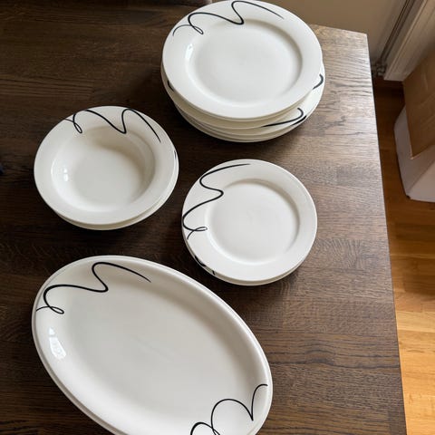 Djupa tallrikar/skålar från Iittala Oiva Marimekko med svart mönster på vit botten. Säljes som set 10 stycken frukostskålar och 10 stycken djupa tallrikar.