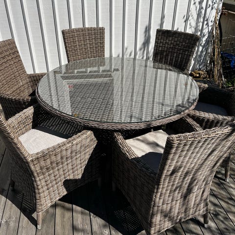 Utegrupp med runt bord med glasskiva och sex vita stolar i rottingstil. Sköna stolar med armstöd som passar bra runt det större bordet.