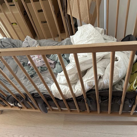 Spjälsäng från IKEA i trä med ribbor runtom. Madrass, madrasskydd och sängkläder (se bild) ingår om så önskas. I princip helt oanvänt.