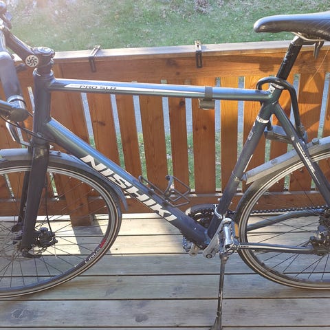 Nishiki hybridcykel för kvinna med 28" hjul och ramstorlek M. Utrustad med skärmar, pakethållare, stöd och handbromsar fram och bak. 21 växlar som fungerar fint, bak och fram handbroms. Rullar smidigt!