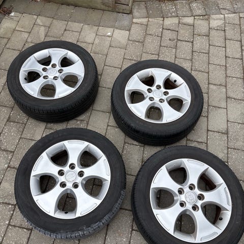Fyra däck med aluminiumfälgar säljes som sats. Femekrade fälgar. Dessa har suttit på en Peugeot 307 men passar också bilar enligt nedan.