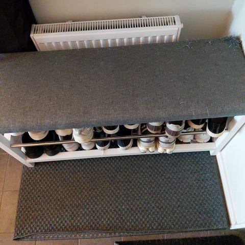 Säljer en vit skohylla från IKEAs Hemnes-serie. En praktisk kombination av skoförvaring och sittbänk som passar perfekt i hallen. Hyllan har två plan med svarta rör för skor och en stabil sittyta ovanpå.