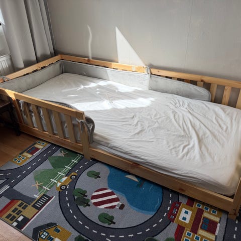 Mått, längden är 130cm med möjlighet att förlänga med 2×35cm, bredden är 80cm. Bra säng. Niklas
