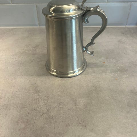 Tennkanna med lock och reliefmotiv på locket, märkt undertill enligt bild. Har rejält handtag, gångjärnslock och är cirka 12–13 cm hög enligt måttstocken på bilden.