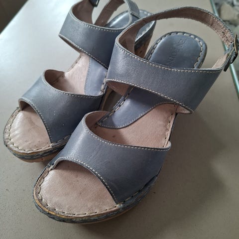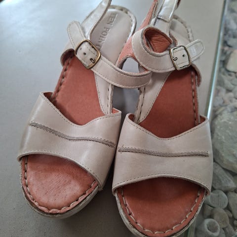 Rosa sandaler från Ten Points i stl 37 med kilklack av kork. Justerbart spänne vid ankeln och breda remmar över foten. Sköna på. Endast använda någon enstaka gång. Skicka meddelande om du vill köpa från mina andra annonser för samfrakt