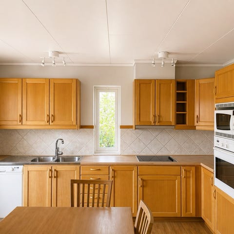 Köksskåp och köksinredning i trä med vitvaror