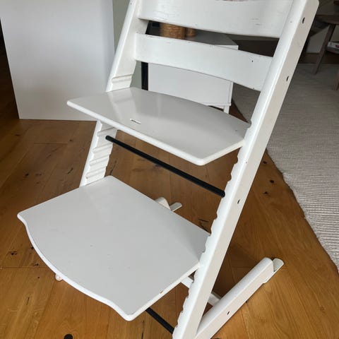 Stokke Tripp Trapp matstol i ljusgrön färg. Justerbar sits och fotstöd som kan flyttas i flera lägen med skruvar på sidorna.