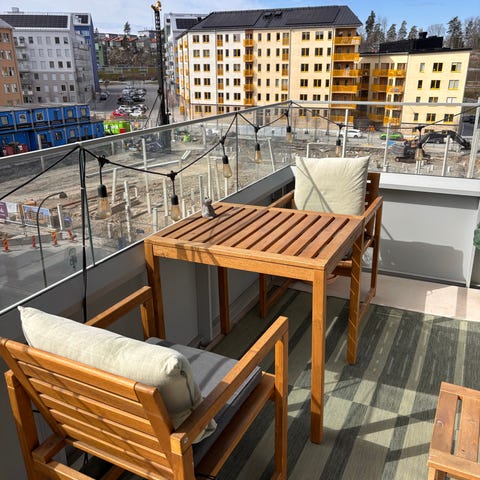 - Fyra stolar med justerbart ryggstöd ned till nästan liggläge. Går fälla ihop vilket förenklar transport och vinterförvaring