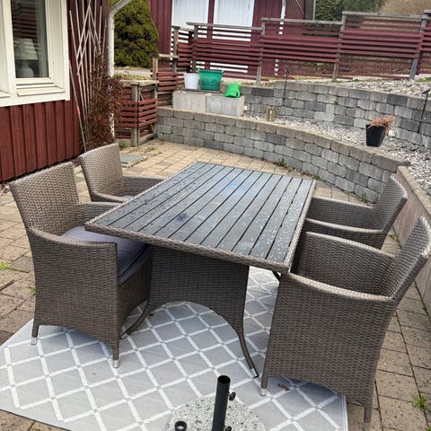 - 2 nyköpta färgburkar. Har påbörjat ommålning av två stolar vilket framgår, övriga möbler är blekta av väder, har delvis tappat färg. Färgen medföljer till en köpare som kan fortsätta ommålningen