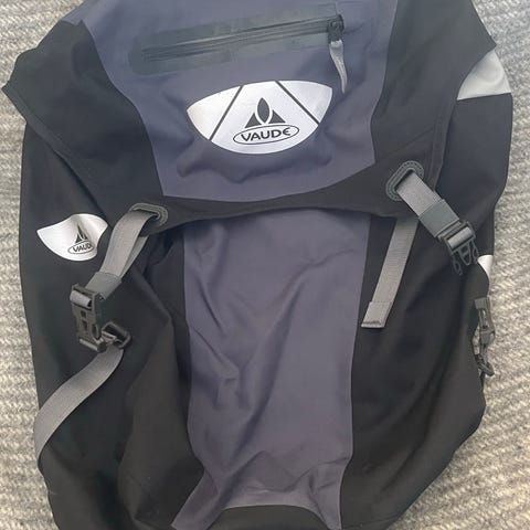 Cykelväska från Vaude i grått och svart, vattentät modell med rullstängning upptill. Fästen på baksidan för pakethållare och reflexdetaljer på sidorna.