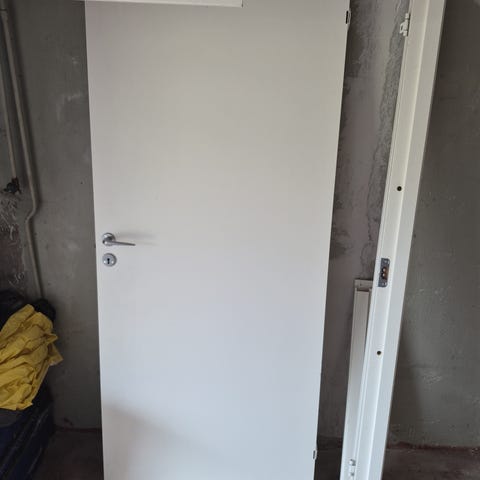 2 st Vita innerdörrar med karm och metallhandtag. Har beslag och gångjärn monterade, redo att sättas in i öppning.