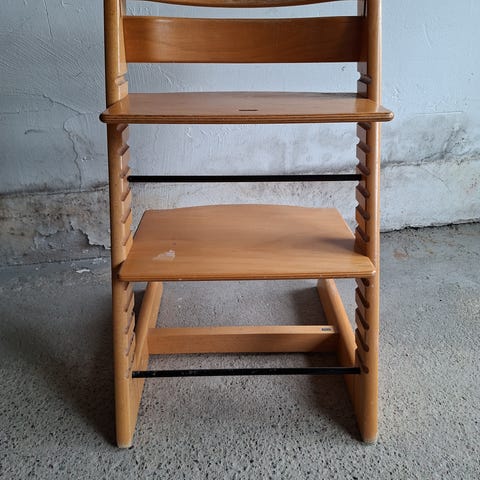 Gul Stokke Tripp Trapp barnstol i trä. Justerbar sits och fotstöd som kan flyttas efter behov.