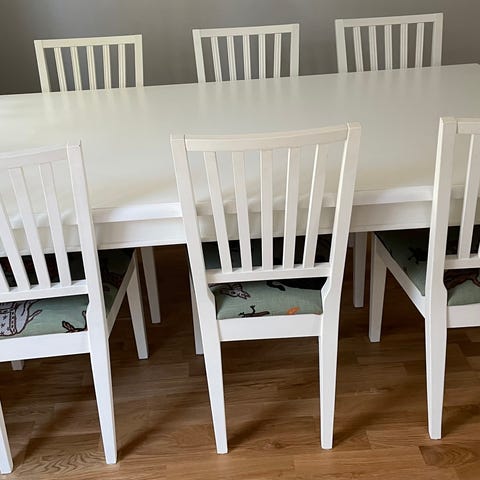 detta fina bord går att fälla ut en eller två skivor på och ge plats för upp till 8 personer!