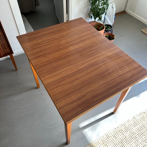 Finns synliga slitage på både bord och stolar absolut inget som stört mig utan har bara gett det mer charm.