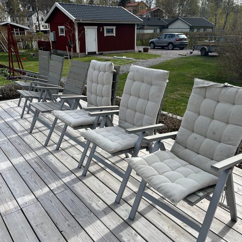 Två solsängar med metallstomme och nätliknande sits och rygg. Båda har armstöd och ställbar ryggdel för bekväm lutning.