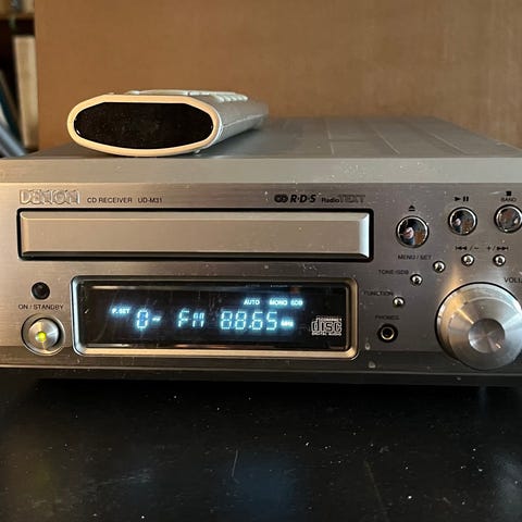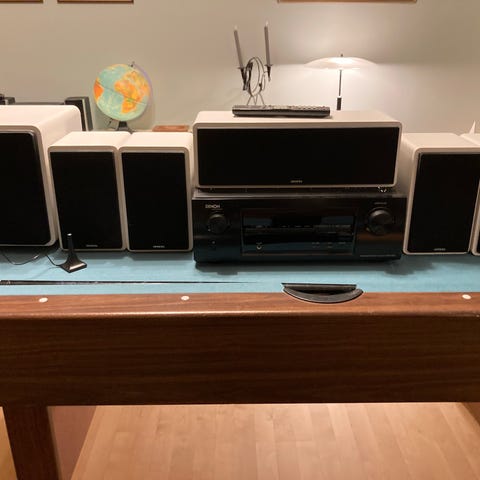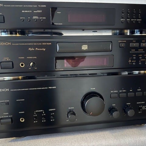 Denon stereoanläggning med högtalare och fjärrkontroll