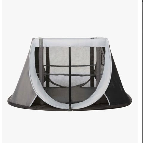 AeroMoov resesäng pop-up i grått med nätväggar runt om. Levereras i hopfällbar väska med bärhandtag och har en vadderad botten.