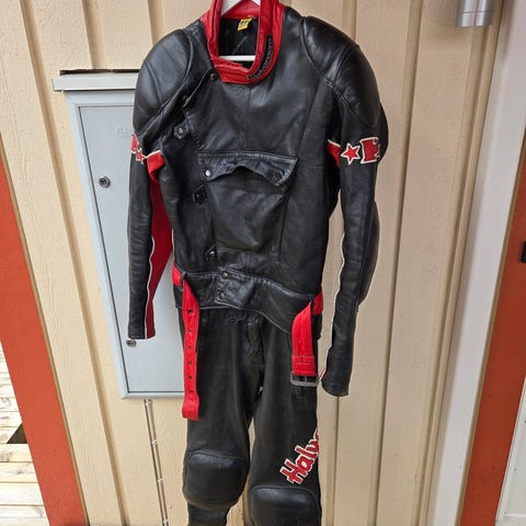 4-bikerjacka i storlek 2X, fast jag hade normalt XL när jag använde denna. Rygg/Axel och armbågsskydd. Kraftigt skinn och inga skador..