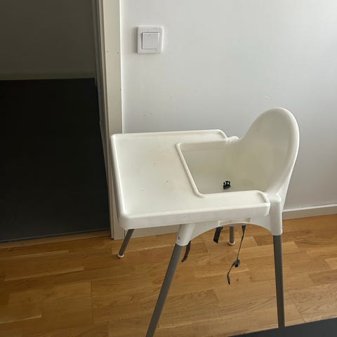 IKEA matstol för barn med avtagbar bricka. Har bälte i sätet och metallben som är lätta att torka av.