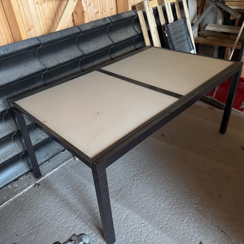 Vitt brickbord i metall med rund bricka och kryssben. Passar bra som litet sidobord på altanen eller inomhus. Helt nytt bara ihopbyggt av min man så det slipper du göra! Du slipper också en klagande man i bilen på väg till Ikea! Hallå win win! Skojar bara. Men det är iaf helt nytt var för stort för våran balkong så kom och hämta i Växjl om du har mer plats!