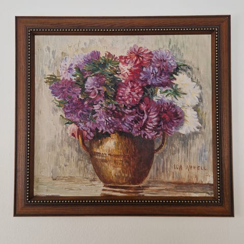 Oljemålning av Sven Davidsson med bukett syrener i vas framför ett fönster. Säljes med träram i guldfärg som syns på bilderna. Mått 92 x 86. Hämtas på plats i Katrineholm