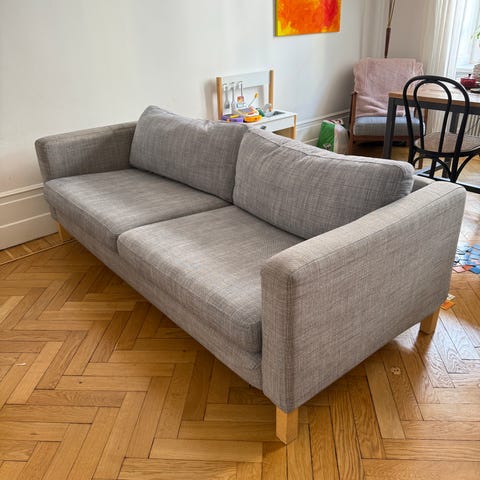 3-sits Karlstad soffa från ikea. Grå klädsel. Gott skick. Står på tre trappor utan hiss.