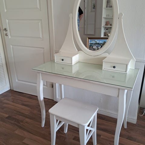 Säljer ett sminkbord från IKEA (HEMNES-serien) med spegel. Klassisk och lite “prinsessig” stil som passar perfekt i sovrum eller walk-in-closet.