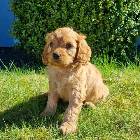 Poppy är en trevlig blandras mellan en kungspudel och en irländsk setter, kallad Irish Doodle, på 18 månader och väger 17kg. Hon är fullt vaccinerad och chippad.